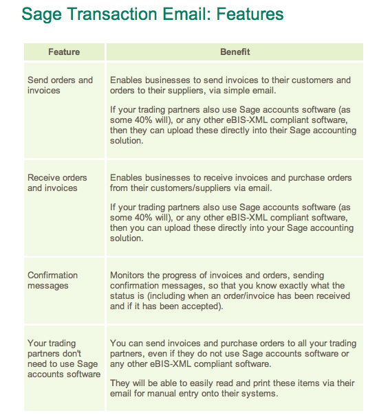 | Streamline the processes of ordering and invoicing with your customers and suppliers Sage Transaction Email helps you to easily send orders and invoices via email, directly from your Sage software, instead of using traditional methods such as printing and posting or faxing. Even if your trading partners are not using Sage (some 40% will have Sage software), the emails automatically present the same information, which they can print and key into their systems. Speeds up the order and invoice cycle However, Sage Transaction Email is not a mandatory requirement to achieve e-Procurement with either public or private sector.